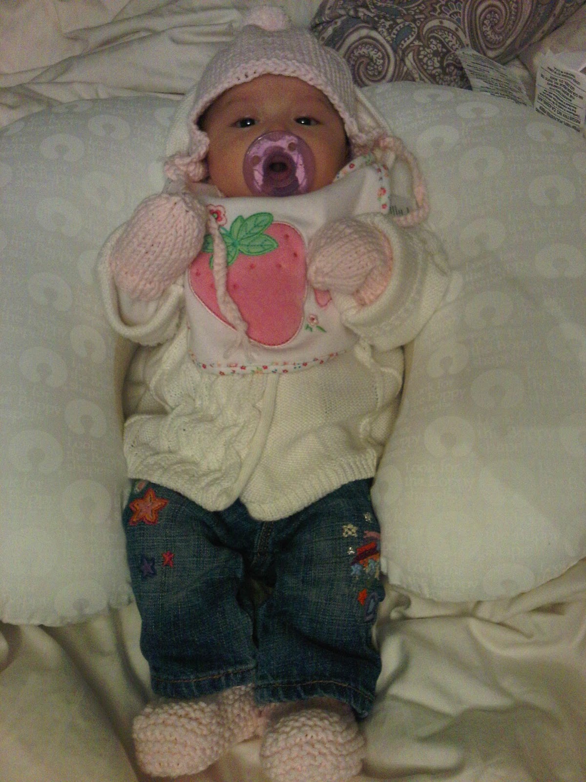 This is baby Charlie wearing her winter set. I loved the Bernat Comfort Worsted Weight Yarn I used in light pink. Its so soft and warm.